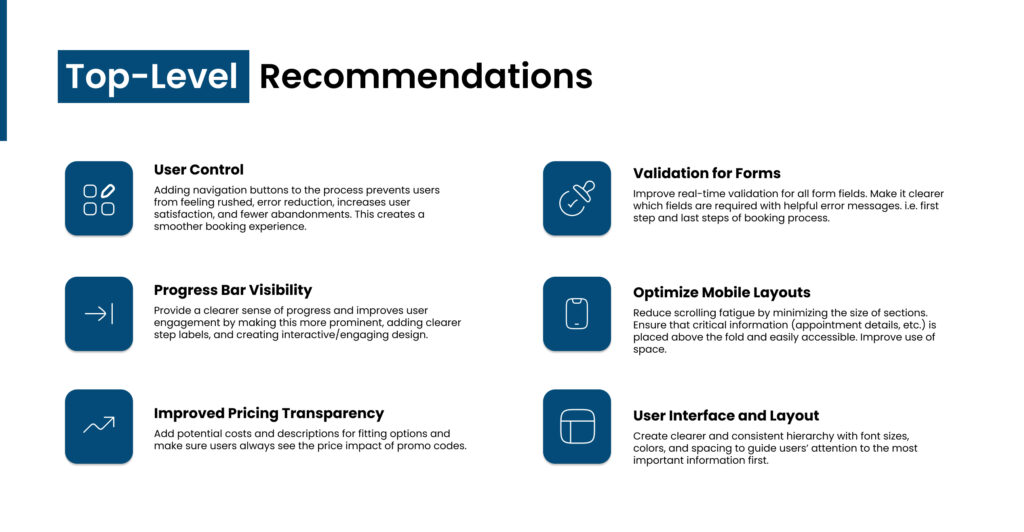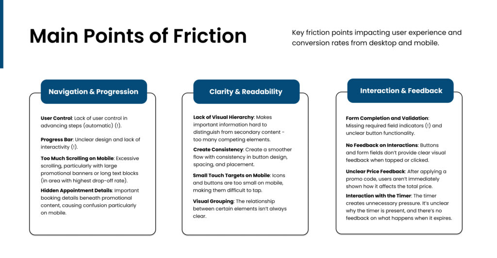 The booking funnel was the critical conversion point where Club Champion was losing the most potential customers. My comprehensive audit revealed that users were abandoning bookings due to lack of control, hidden pricing, and mobile usability issues.